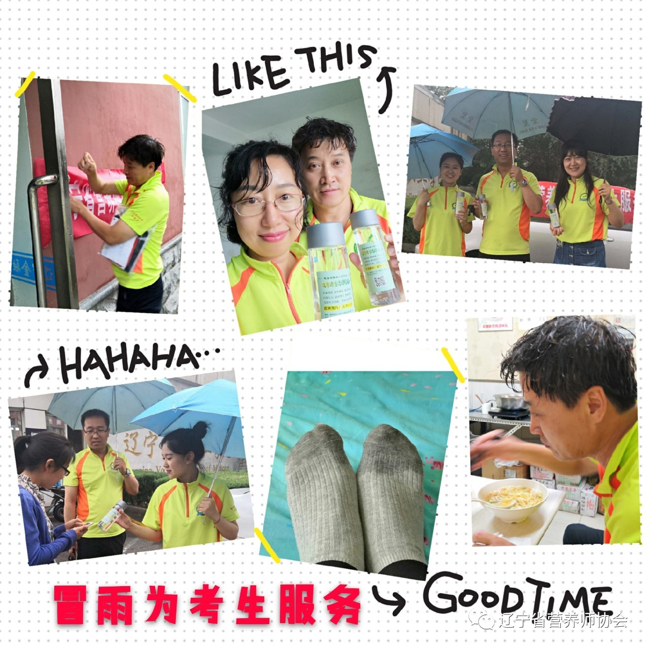 有一个考场只能在大门外打着雨伞为考生发水。湿透的衣服和头发并么有影响我们给考生服务的心情,我们笑脸洋溢,让考生感动!晓晶老师更是在中午,顶着当天最大的雨,开车一个半小时从沈阳最南边的考场赶到了最北边的考场!这就是我们,一个有凝聚力和战斗力的团队!